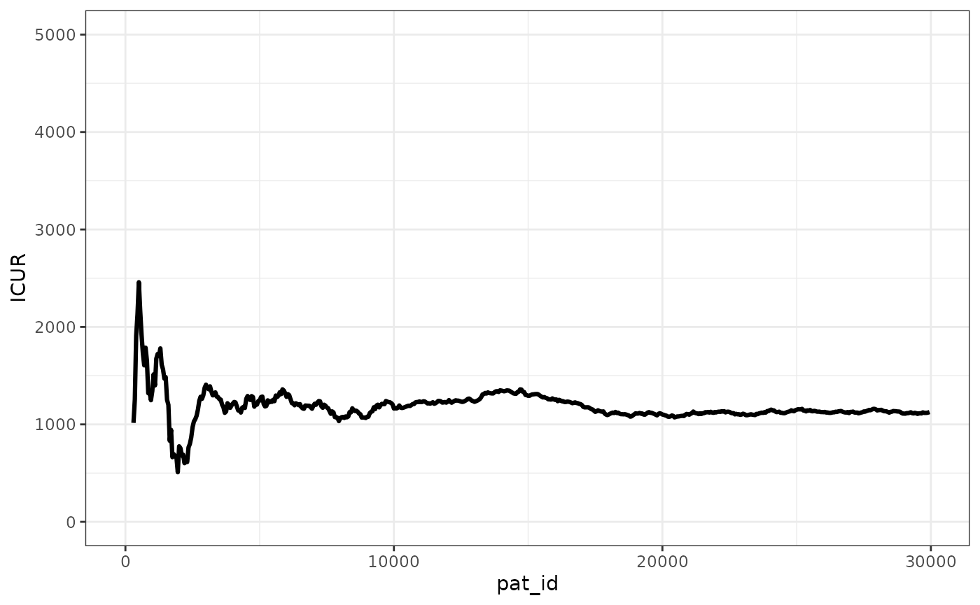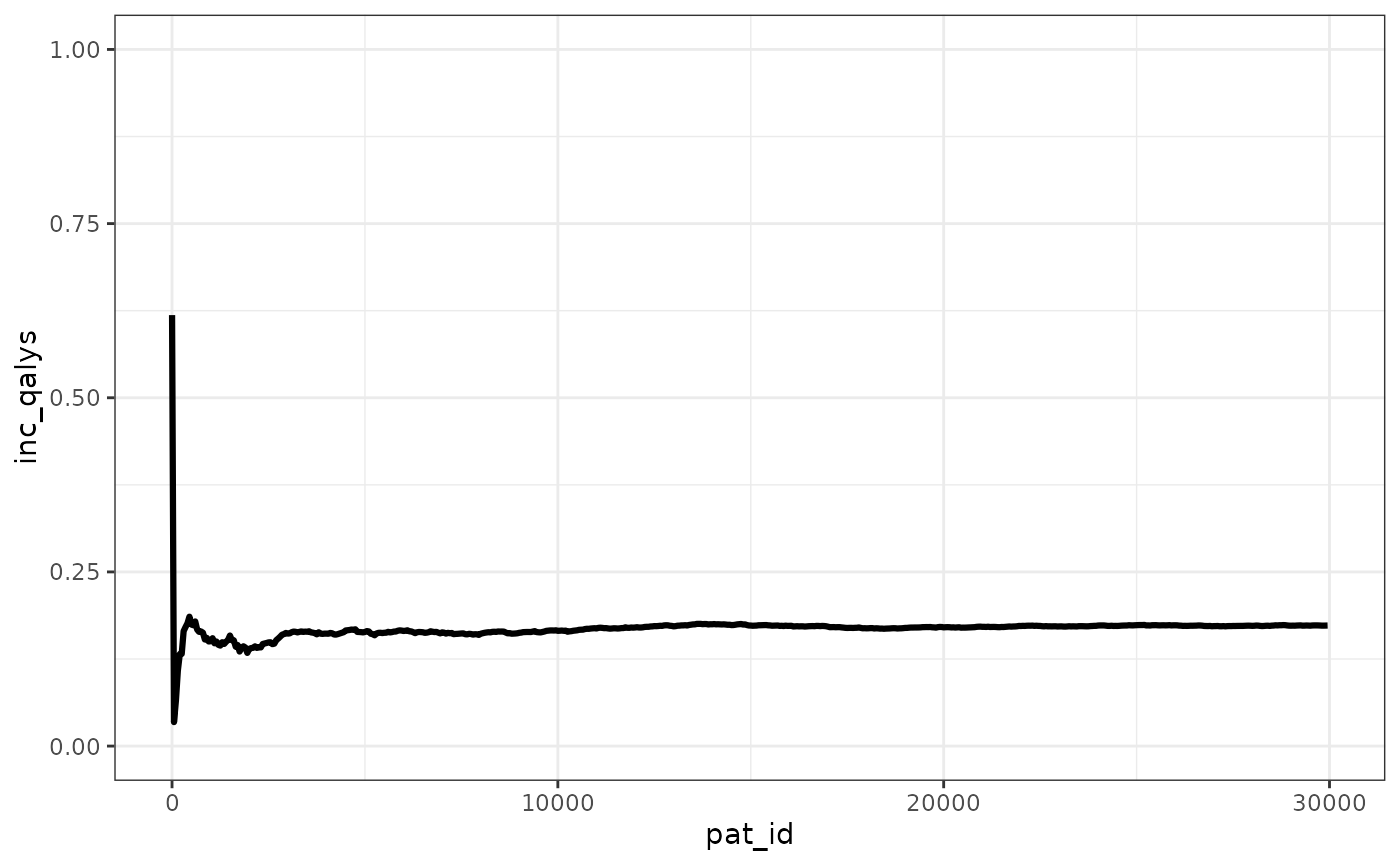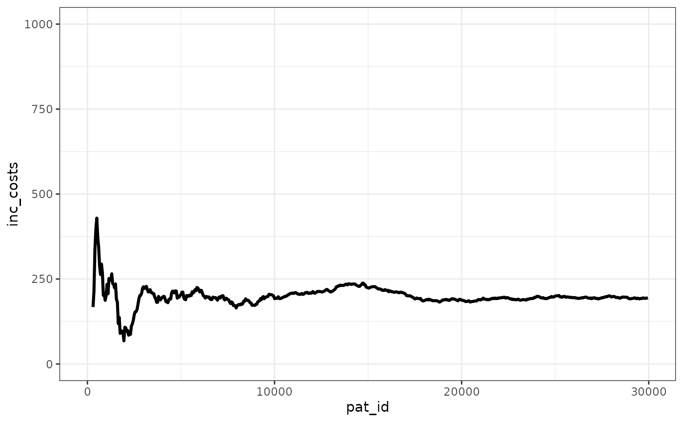 We can see that the ICER stabilizes pretty quickly, with the ICUR changing in absolute terms less than 500 GBP after 2,500 patients simulated.